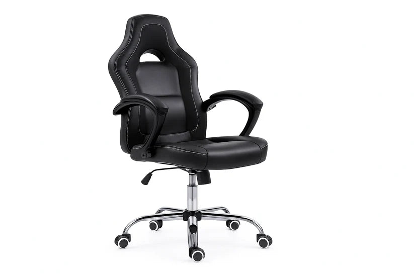 Chaise gaming noire, sobre et élégante.
